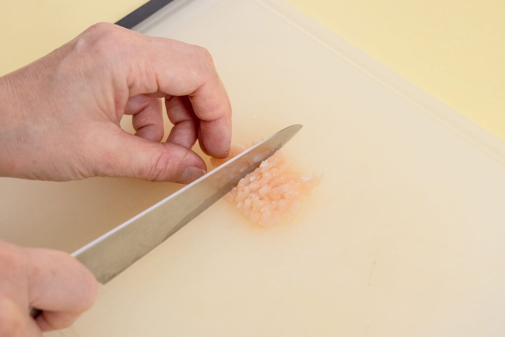 さつまいもの皮を厚くむき、3mm角に切って水にさらす。鶏ひき肉は細かく刻む。