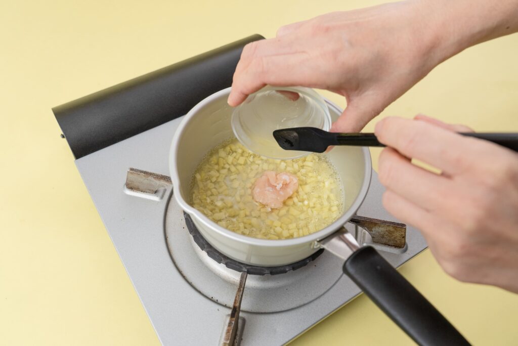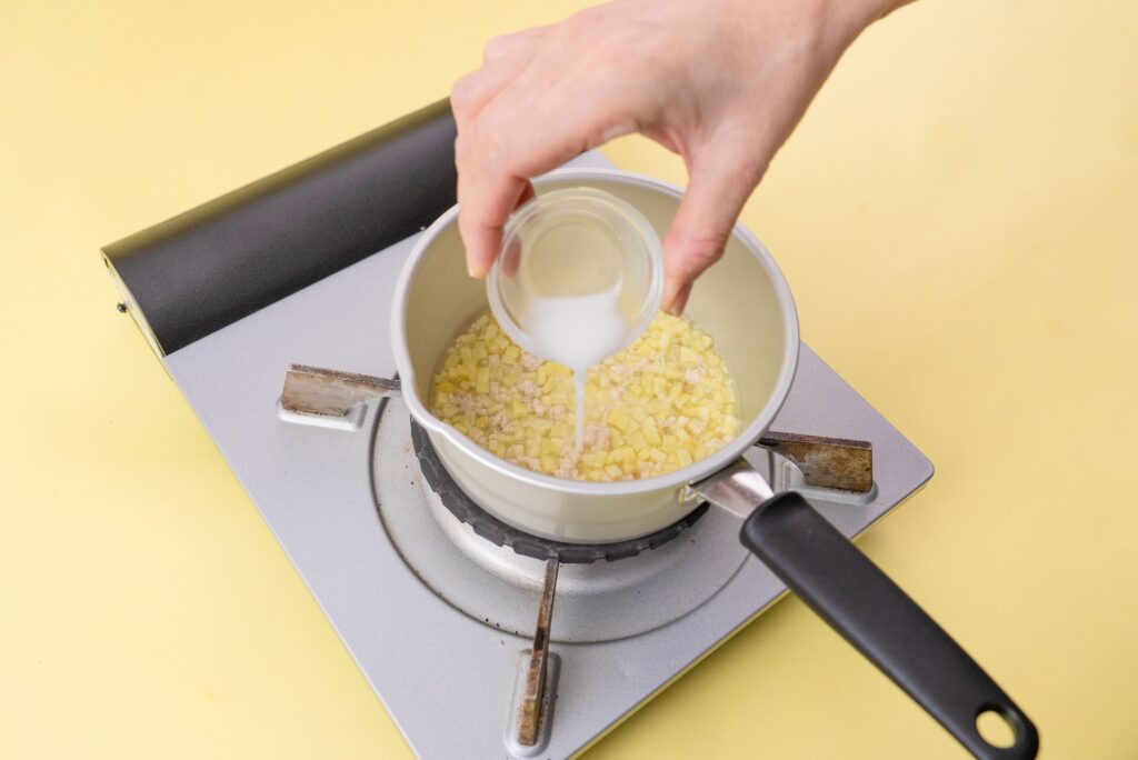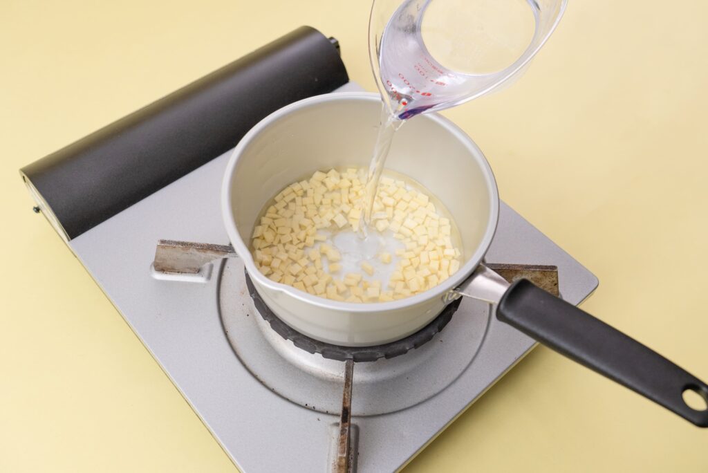 小鍋にだし汁、さつまいも、浸るぐらいの水を入れ、さつまいもがやわらかくなるまで煮る。
