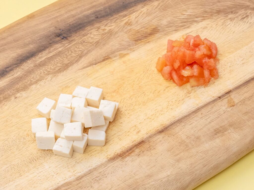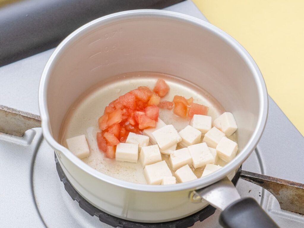 豆腐は1cm角に切る。トマトは皮と種を除き、5mm角に切る。