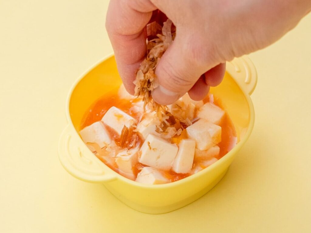 水溶き片栗粉でとろみをつけ、器に盛り、かつお節をのせる。(混ぜて食べさせてください。)