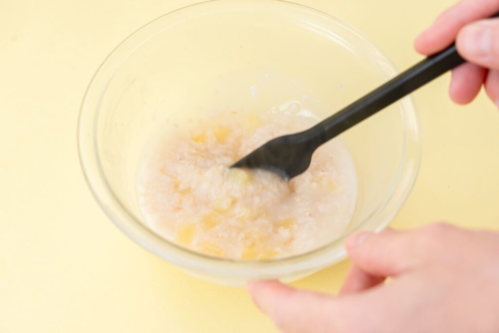 - 7~8ヶ月ごろ(中期)を目安にしています。指で楽につぶすことのできる絹ごし豆腐くらいのかたさを目安に、お子様の様子に合わせて食材の大きさや固さ、量は調整してください。