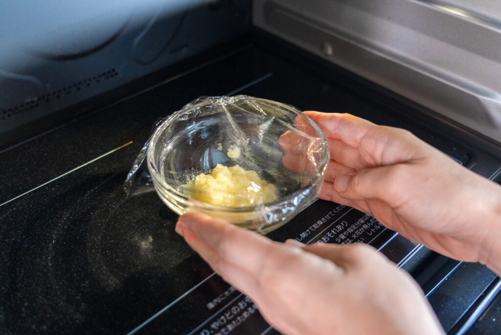 ①を耐熱容器に入れてふんわりとラップをし、電子レンジ(600W)で1分ほど加熱する。