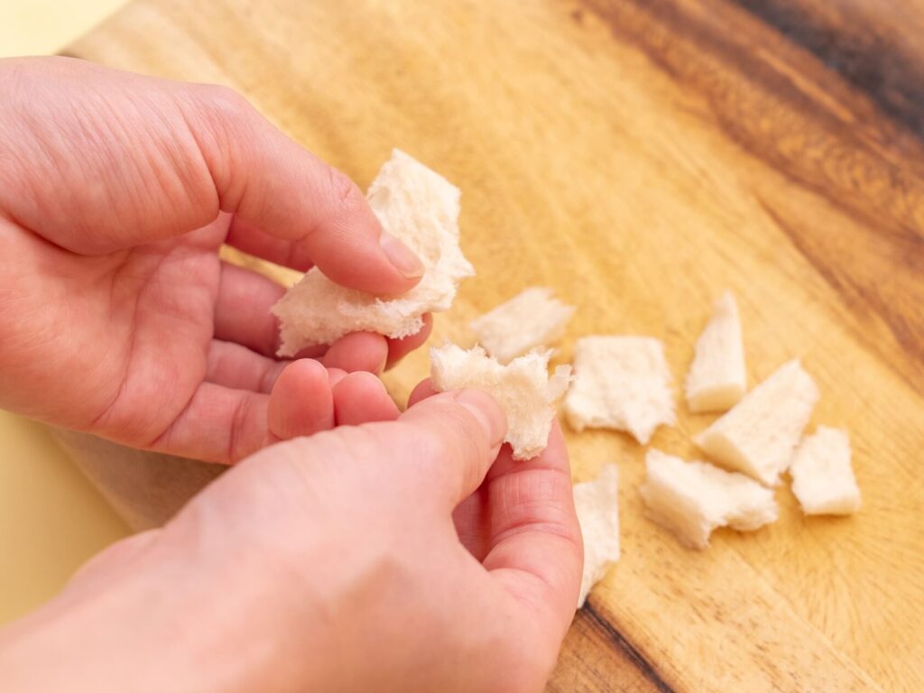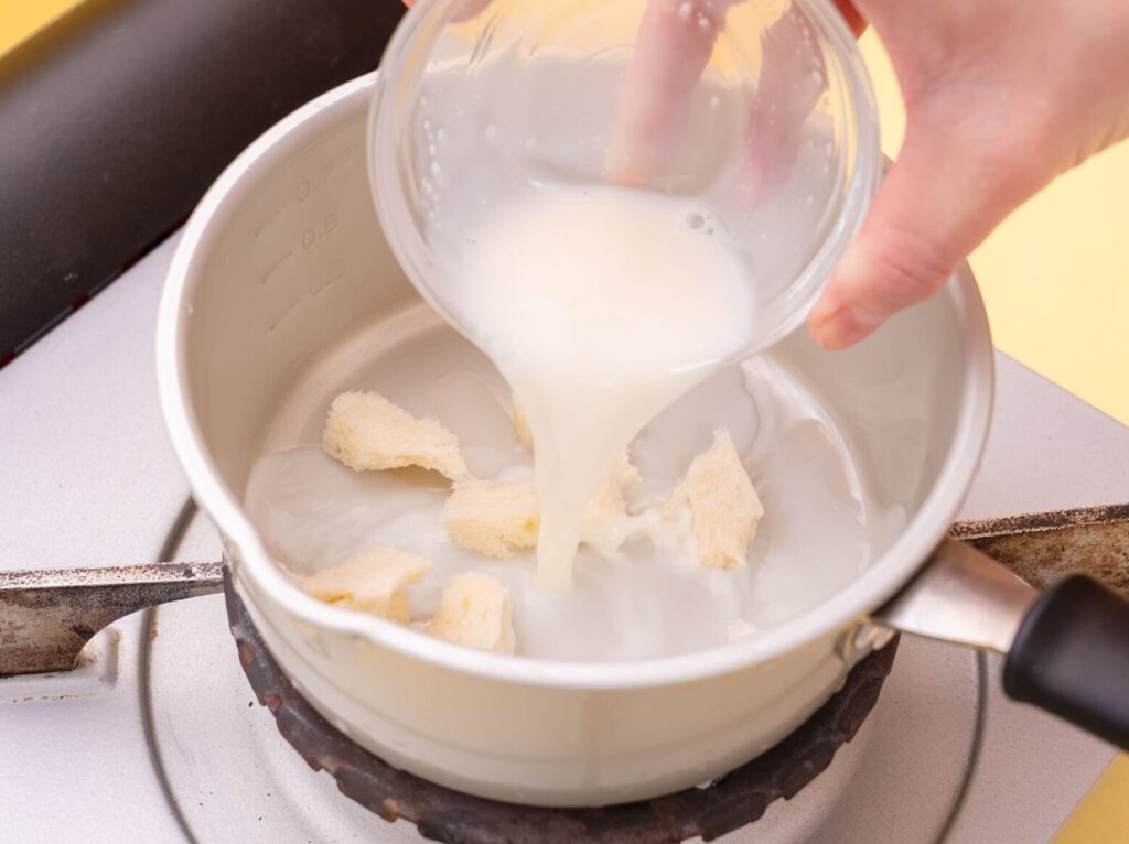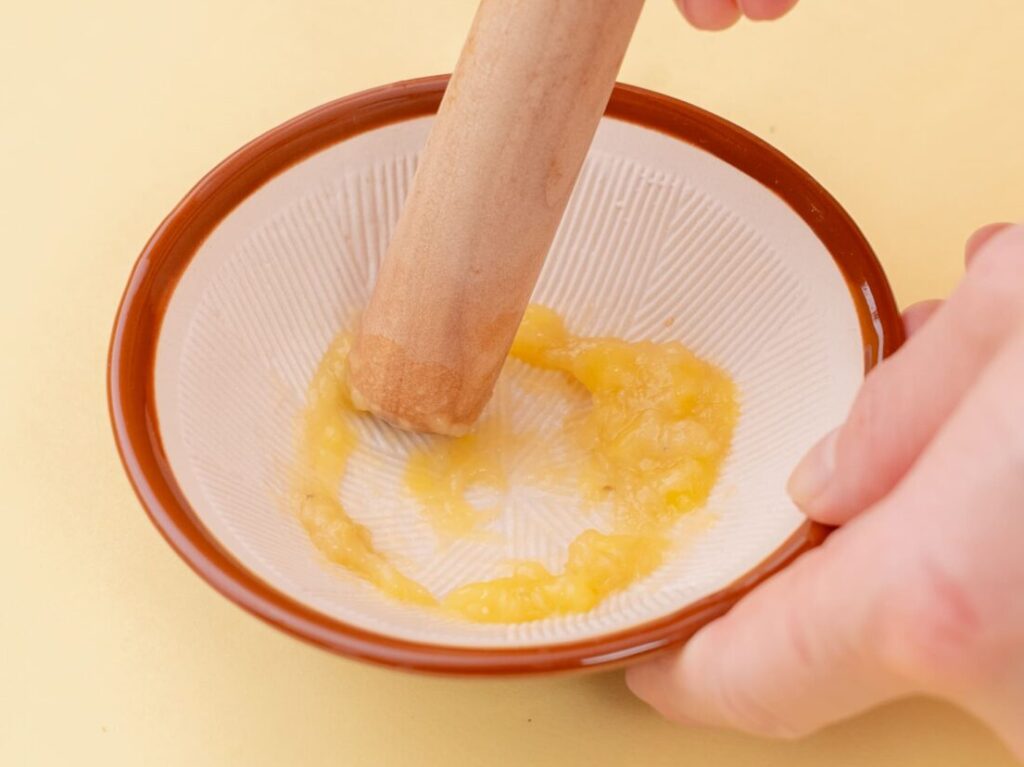 耐熱容器にバナナを入れ、ラップをして電子レンジ(600W)で20秒ほど加熱する。加熱後、すりつぶしてお湯でのばす。