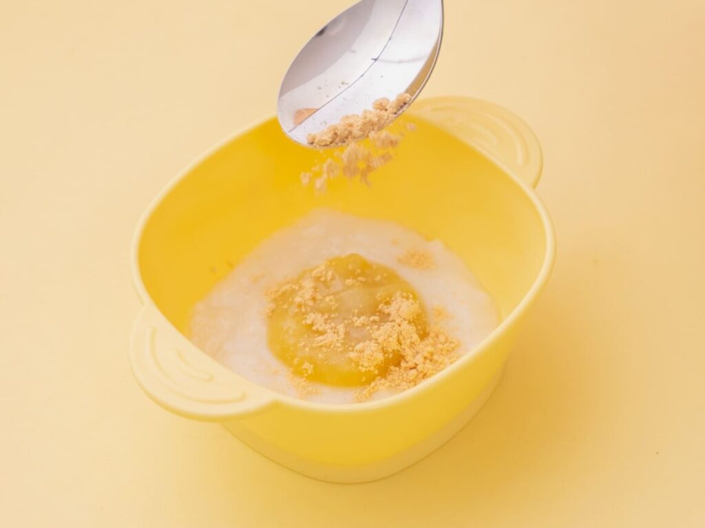 鍋に①と育児用ミルクを入れ、弱火で3分ほど煮てからとろとろになるまですりつぶして器に盛る。