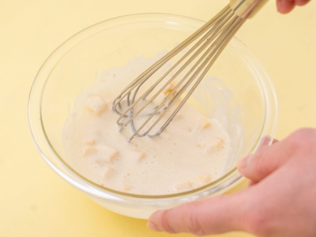 ボウルに【A】、牛乳を入れて泡立て器で混ぜ合わせ、①を加えてさらに混ぜる。