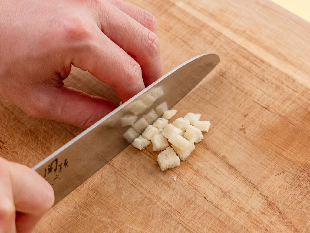 食パンはみみを取り除いて、細かく切る。(手でちぎってもOK)
