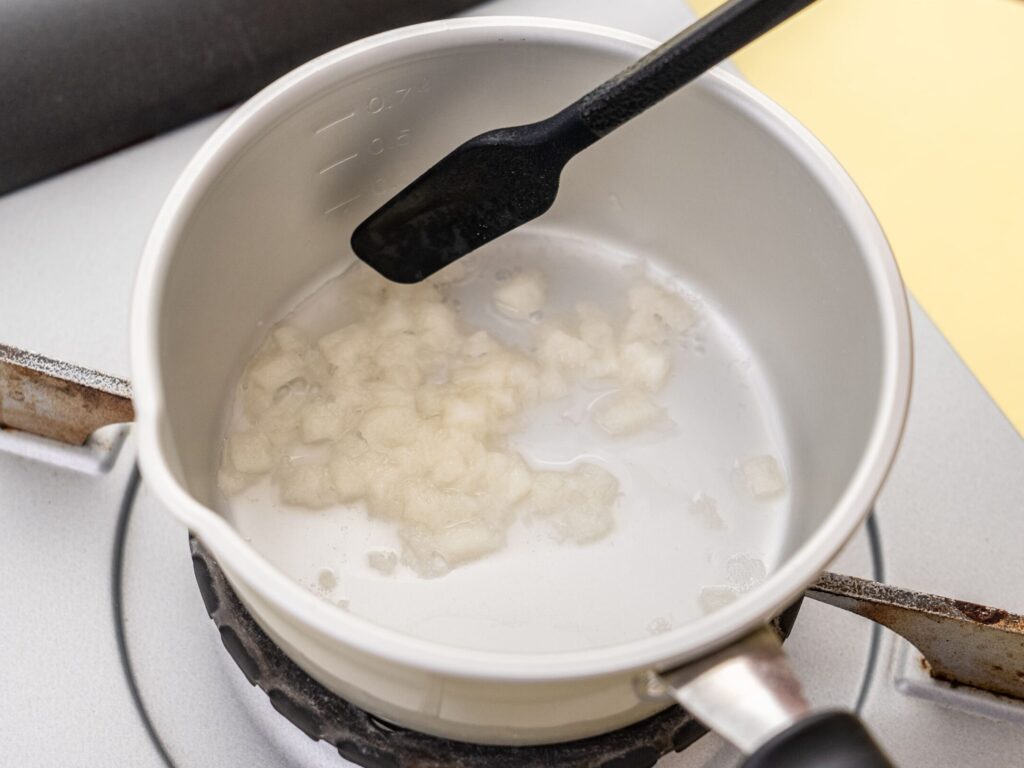 小鍋に①、水を入れて弱火にかける。パンが水分を吸ってやわらかくふやけるまで煮て火を止め、粗熱をとる。