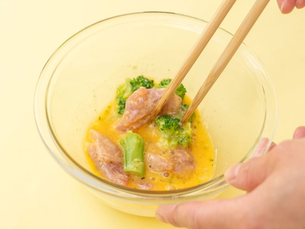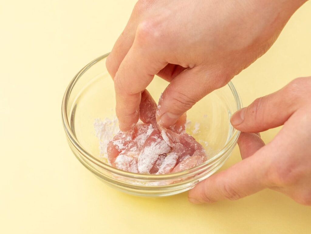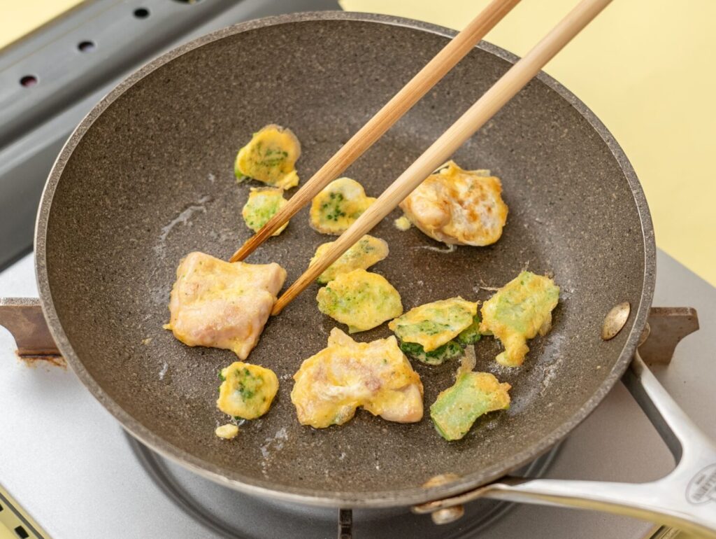 鶏もも肉は5〜6mm厚さのそぎ切りにして、塩をふって小麦粉をまぶす。ブロッコリーはやわらかくゆで、食べやすい大きさに切る。
