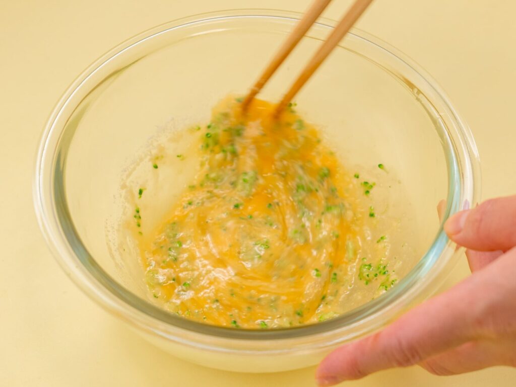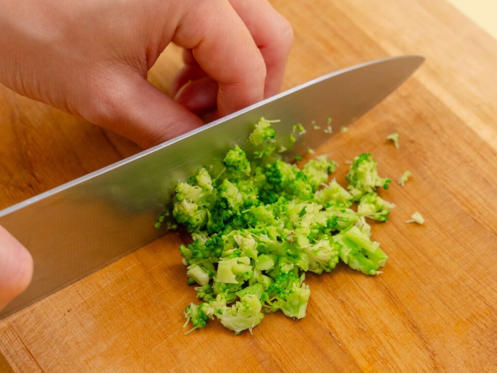 ブロッコリーは小房に分けてゆで、2〜3mmサイズにカットする。