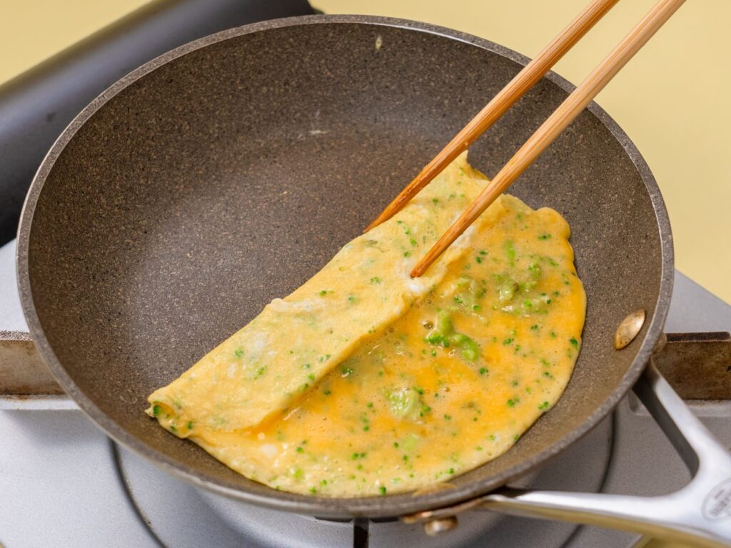 フライパンに油をひいて、②を流し入れ、くるくると巻きながら焼く。粗熱をとり、食べやすい大きさに切り分ける。