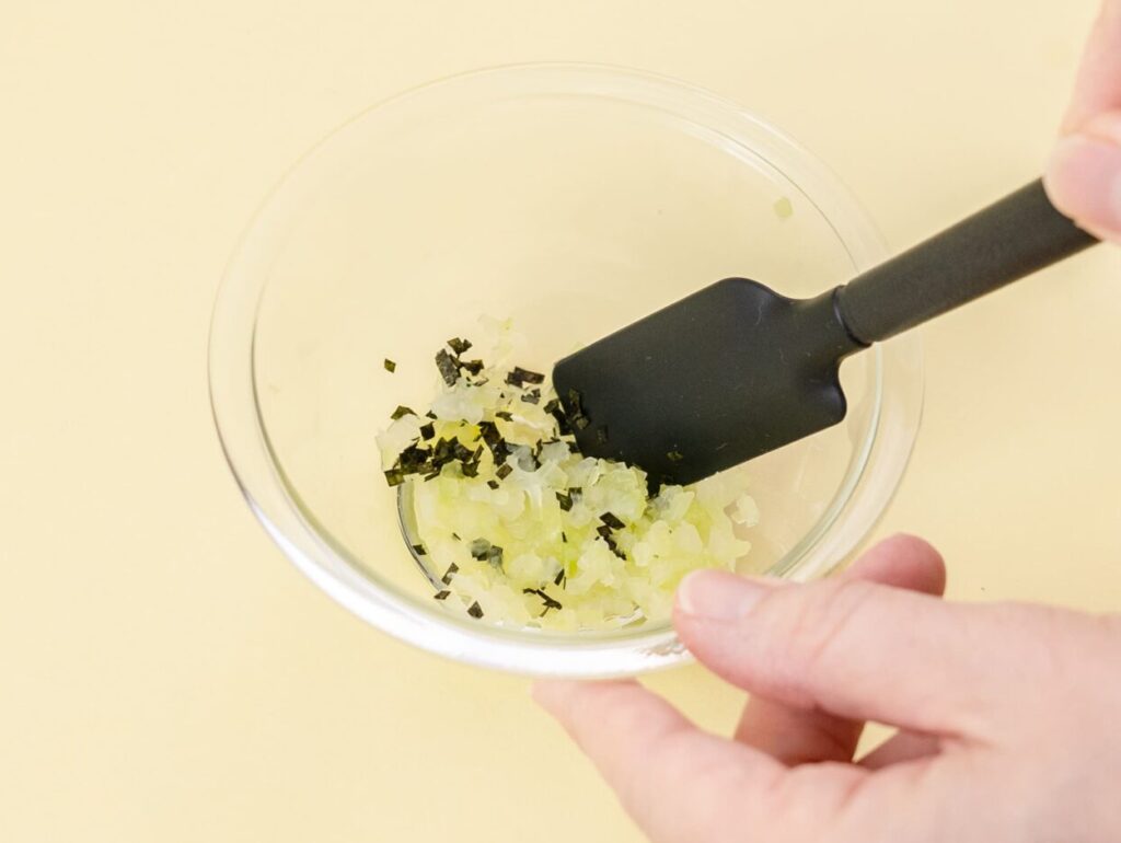 ボウルに①、だし汁を入れて混ぜ、はさみで約2〜3mmサイズに切った焼きのりを入れて和える。