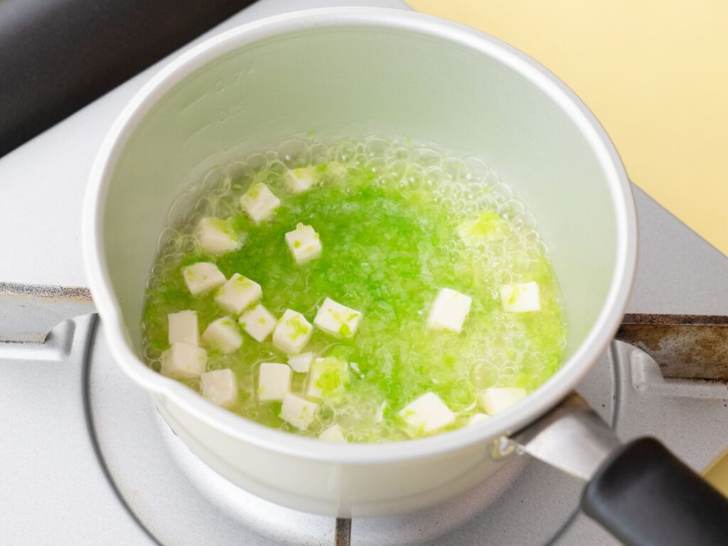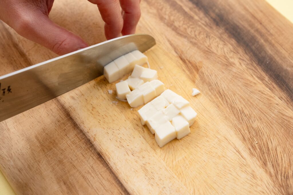 豆腐はゆでて5mmの角切りにする。キャベツはやわらかくゆでて、みじん切りにする。