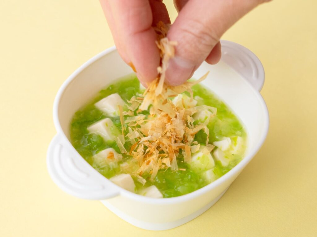 - 7~8か月ごろ(中期)を目安にしています。指で楽につぶすことのできる絹ごし豆腐くらいのかたさを目安に、お子さまの様子に合わせて食材の大きさやかたさ、量は調整してください。