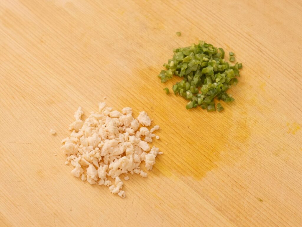 鶏ささみ肉はしっかり火が通るまでゆで、かぼちゃ、さやいんげんはやわらかくなるまでゆでる。鶏ささみ肉とさやいんげんはみじん切りにする。