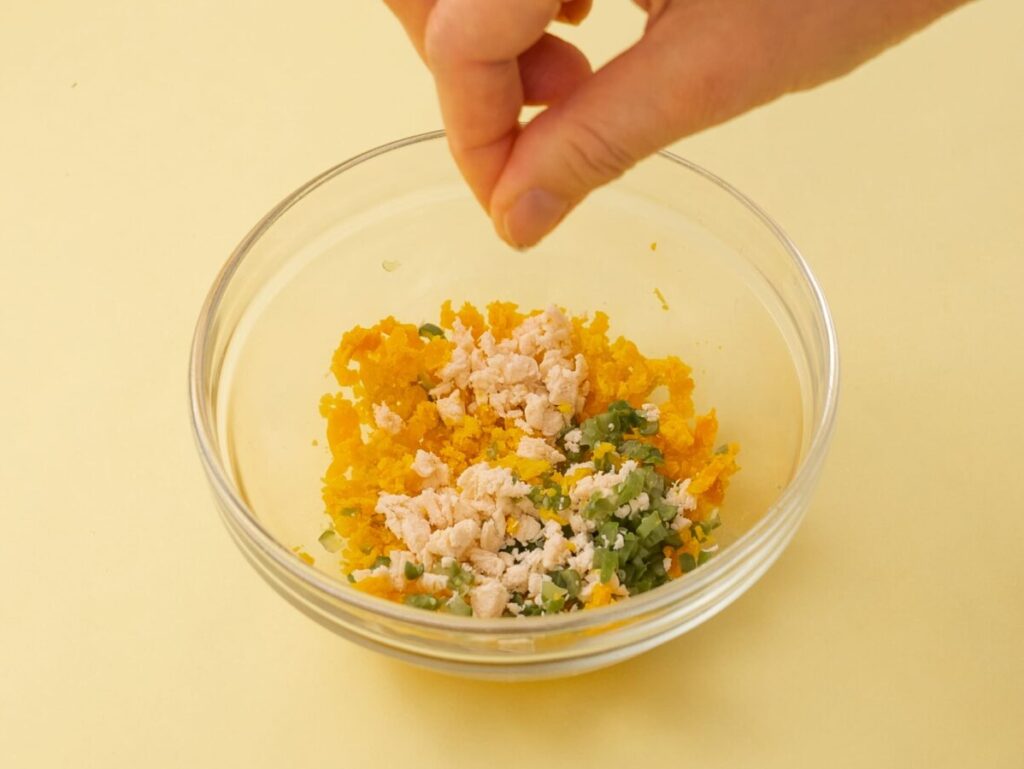 ボウルに②のかぼちゃを入れてつぶし、②の残りの食材と塩を加えて混ぜる。