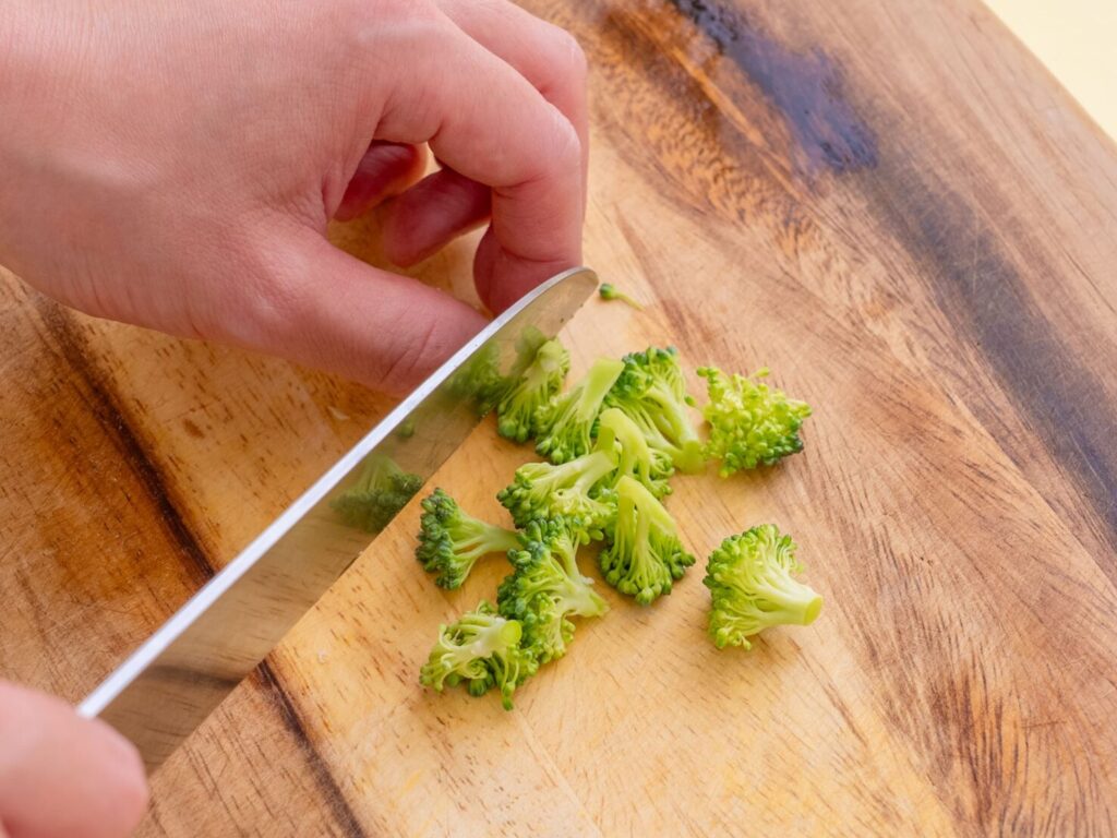 鶏ささみはゆでて細かくほぐす。ブロッコリーは小さめの小房にほぐす。