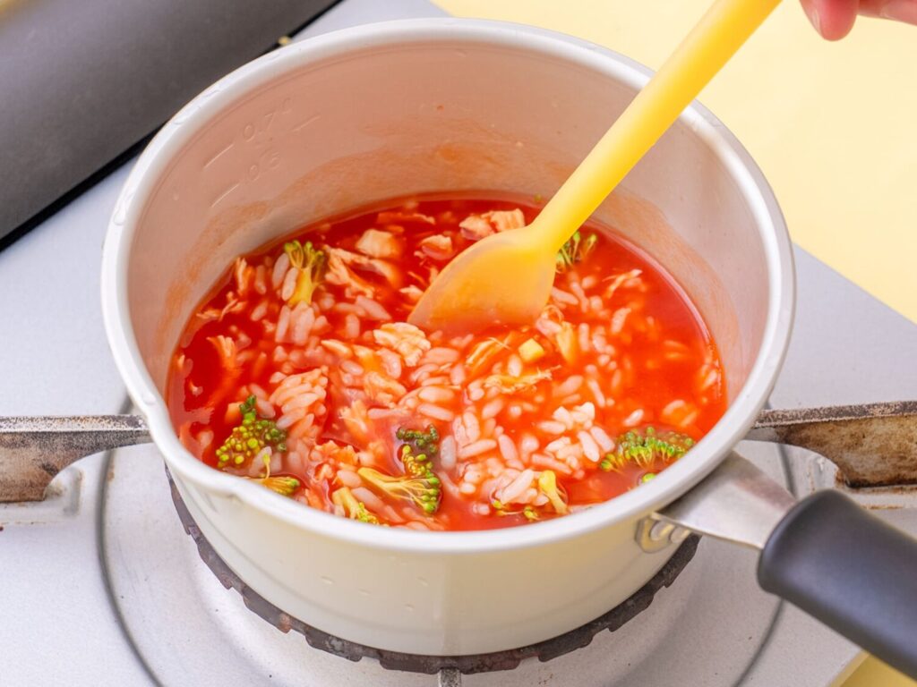 鍋にトマトジュース、軟飯、鶏ささみ、ブロッコリーを入れてブロッコリーが柔らかくなるまで煮る。