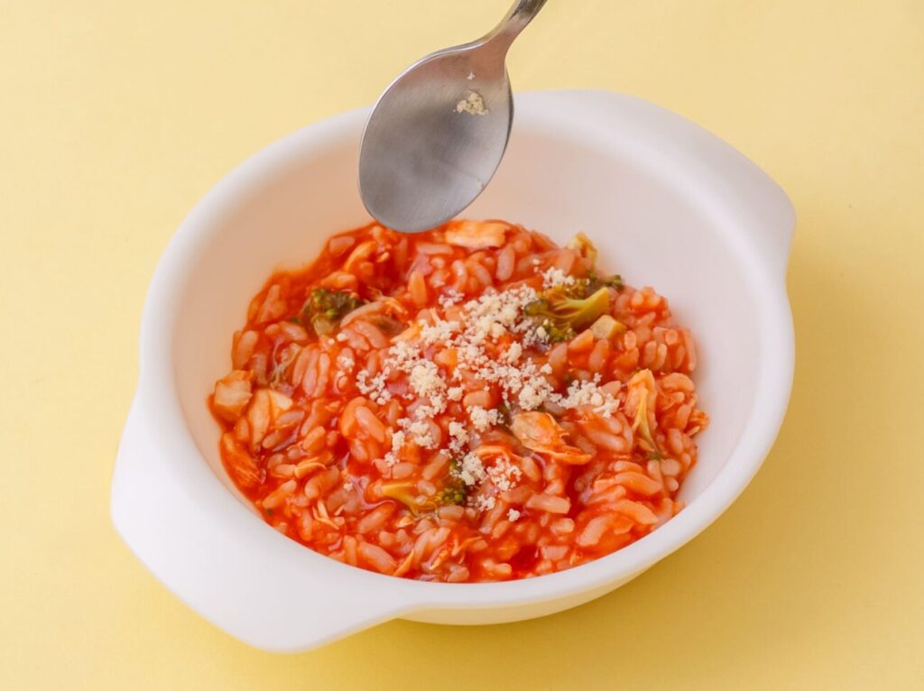 歯茎でつぶせるバナナくらいのかたさを目安に、お子様の様子に合わせて食材の大きさや固さ、量は調整してください。 - 初めての食材を与えるときは食物アレルギーに注意し、複数の食材といっしょに与えることはせず、小さじ1程度の量を午前中に与え、食後の様子を見守ってください。アレルギーのリスクがある場合やアレルギーと診断されている場合は、医師の指導に従ってください。
