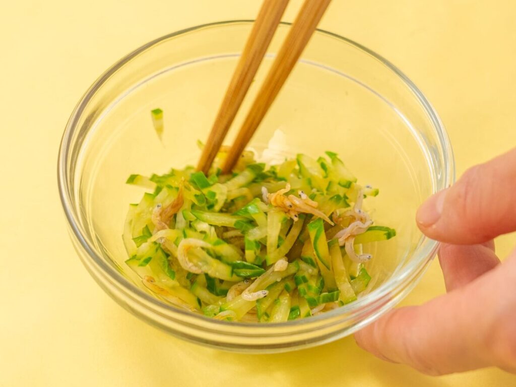 しらす干しは茶こしに入れて熱湯を回しかけて塩抜きをし、きゅうりは1cm長さの千切りにする。