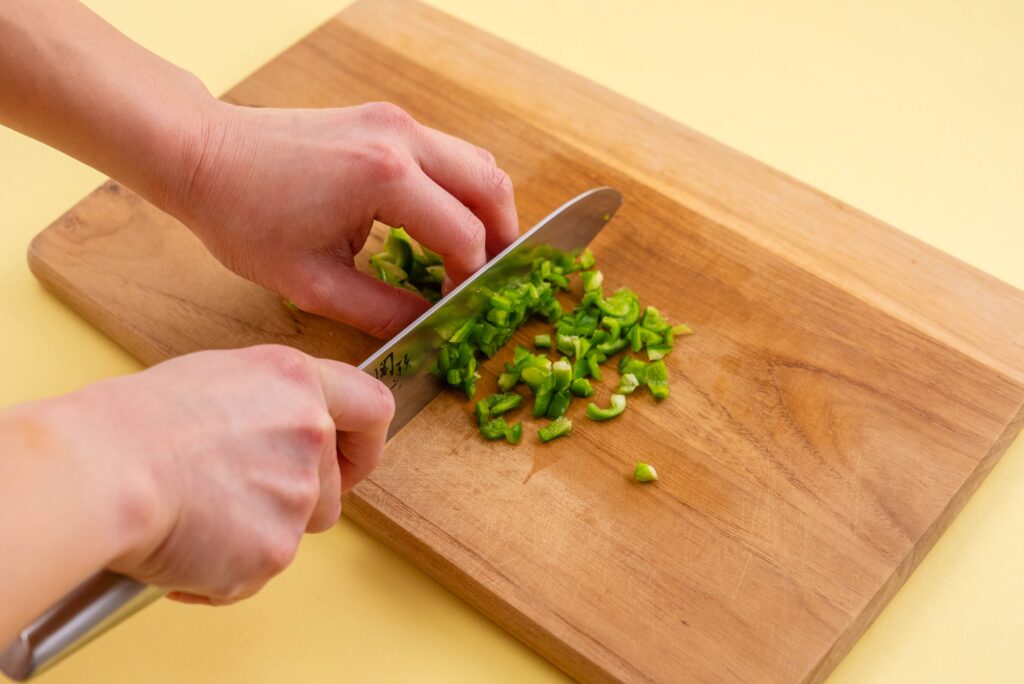 ピーマンはヘタと種を除き、みじん切りにする。