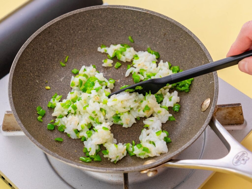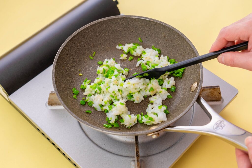 フライパンに油を中火で熱し、①を入れて2分ほど炒め、軟飯を加えて全体を炒める。