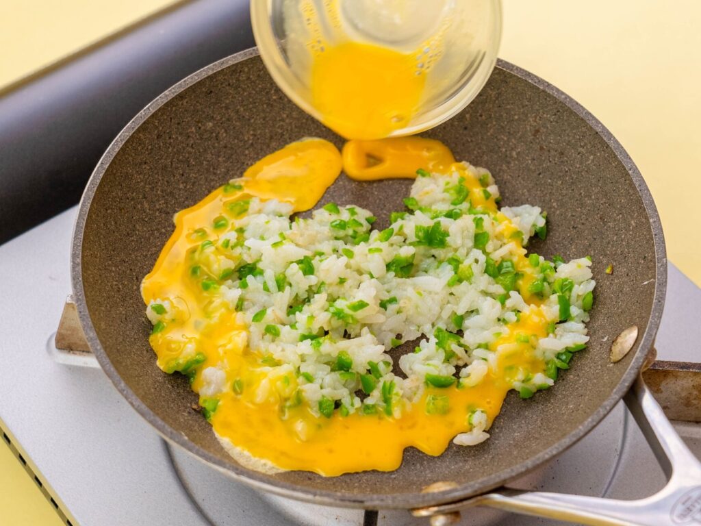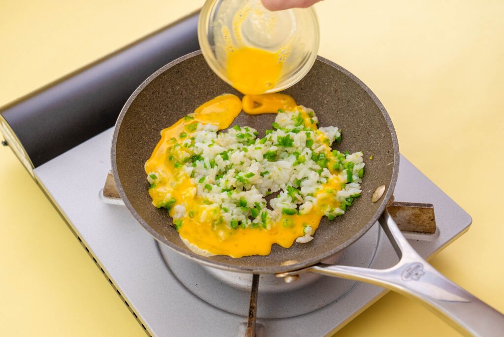 溶き卵を回し入れ、卵に火が通るまで混ぜながら炒める。