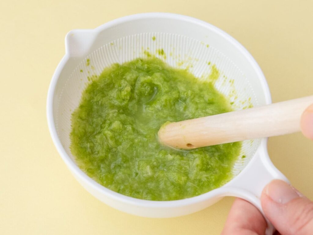 すり鉢などですりつぶし(ハンドブレンダーなどを使用してもOK)、必要であればゆで汁でなめらかになるまでのばす。赤ちゃんの発達に合わせて必要であれば裏ごしする。