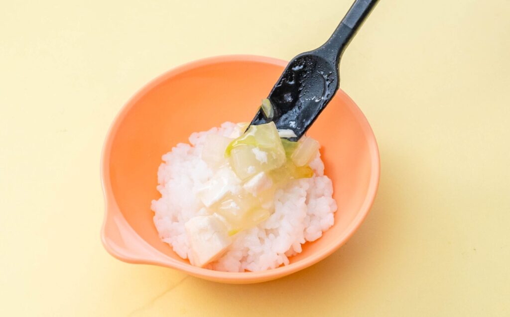 - 9~11ヶ月ごろ(後期)を目安にしています。歯茎でつぶせるバナナくらいのかたさを目安に、お子様の様子に合わせて食材の大きさや固さ、量は調整してください。