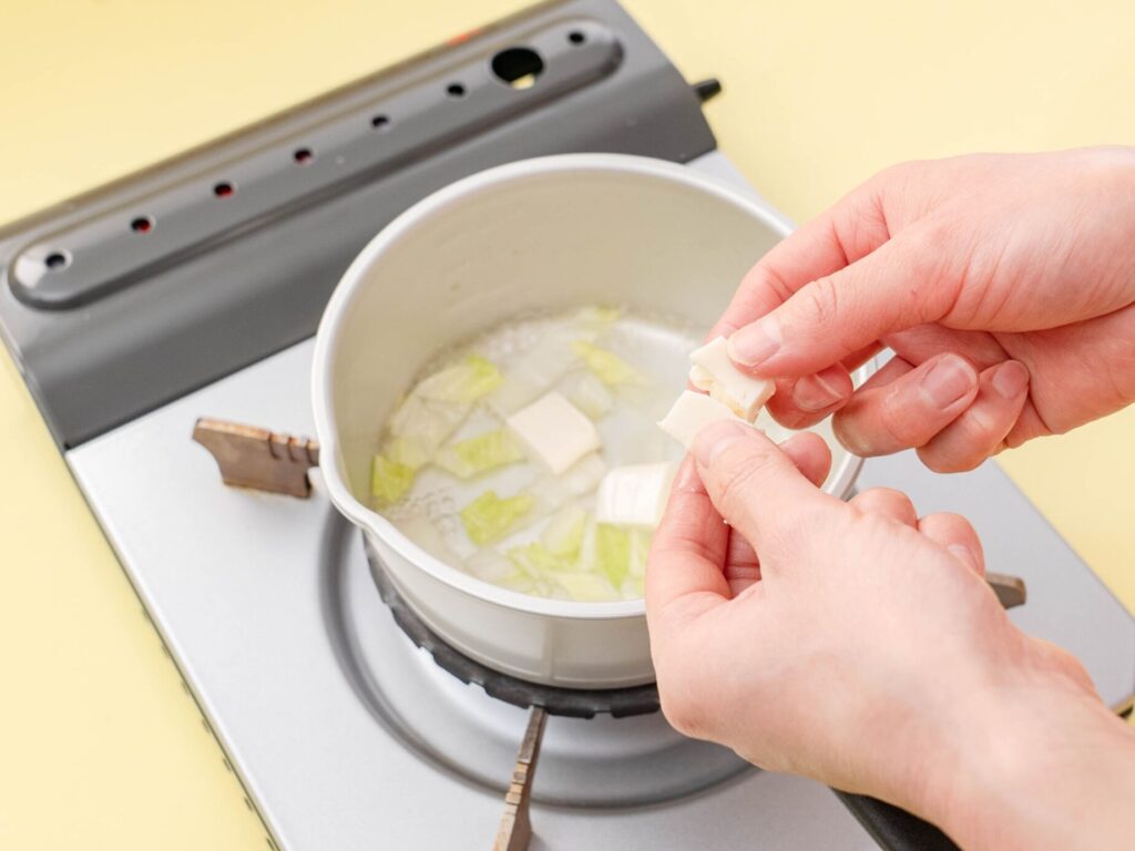 白菜がやわらかくなったら、豆腐をくずして加え、水溶き片栗粉でとろみをつける。