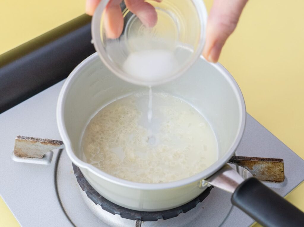 小鍋に粉ミルク、①を入れ、やわらかく煮て、水溶き片栗粉を加えてとろみをつける。