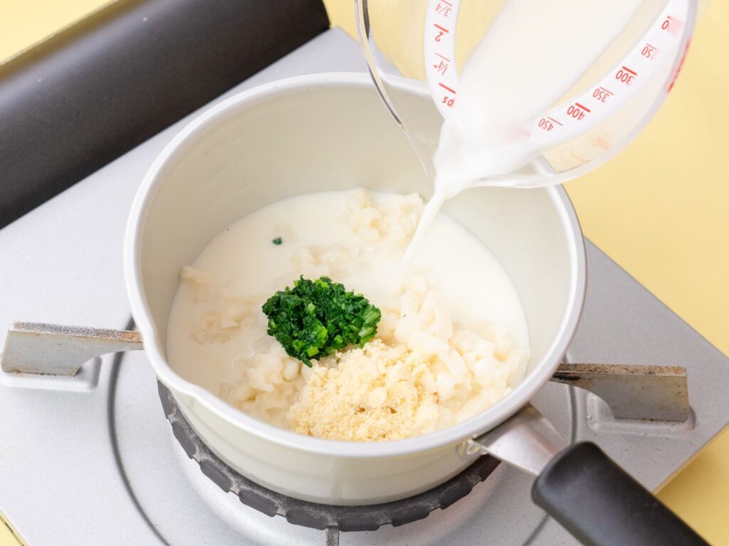 小鍋に①、②、高野豆腐、粉ミルクを入れて煮る。