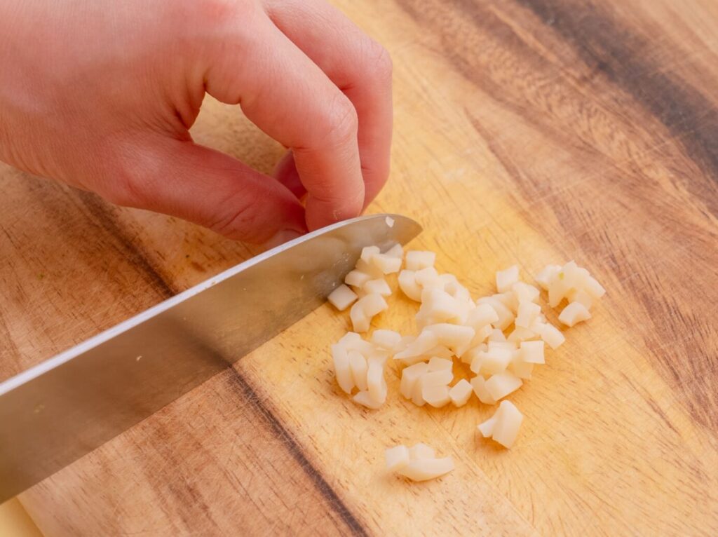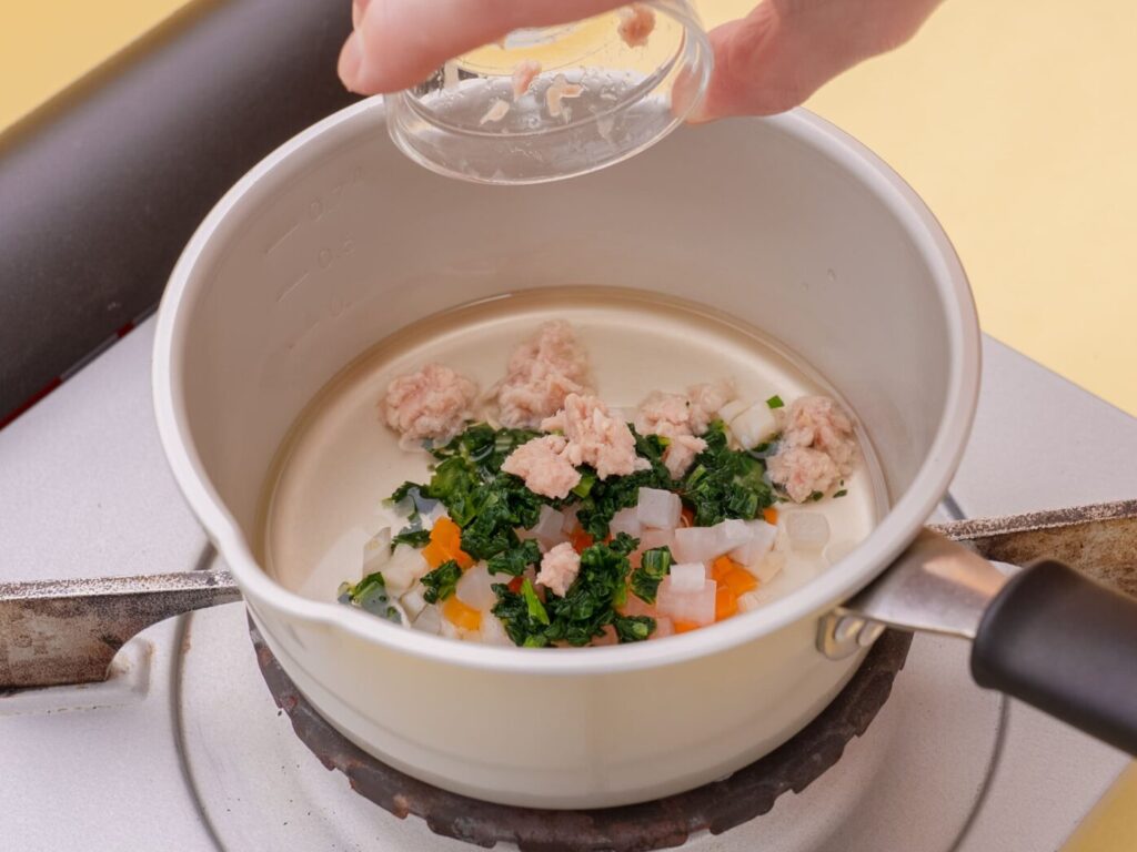 ゆでうどんは2~3mmの長さに切る。小松菜は柔らかく茹でてみじん切りにする。皮をむいたにんじんと大根を柔らかくなるまで煮て、2~3mm角に切る。