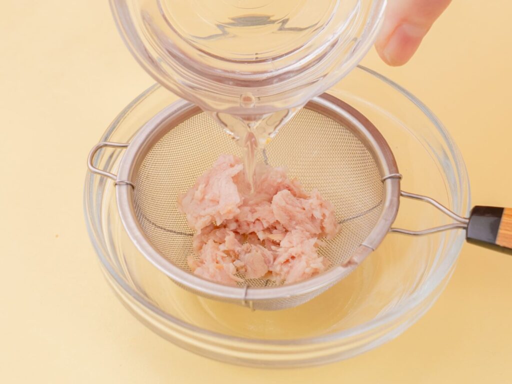 ツナ缶(水煮)は茶こしに入れて熱湯を回しかける。水気を切り、細かくほぐす。