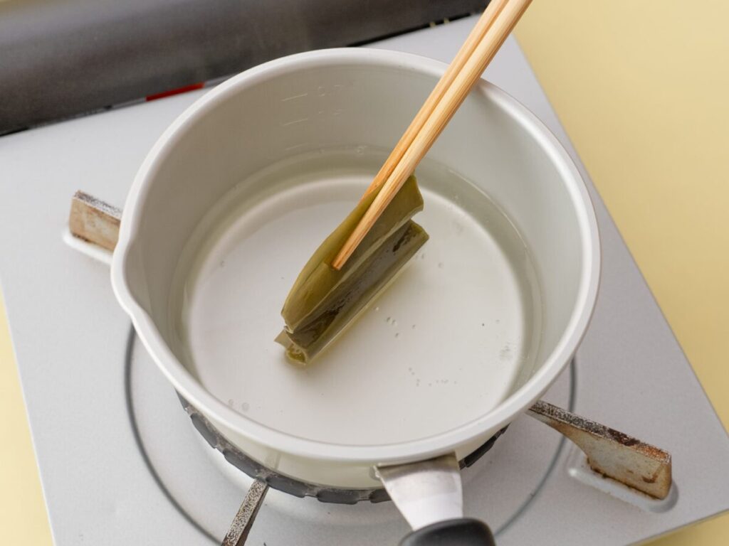 弱火にかけ、水泡が出てきたら昆布を取り出し、火を止める。