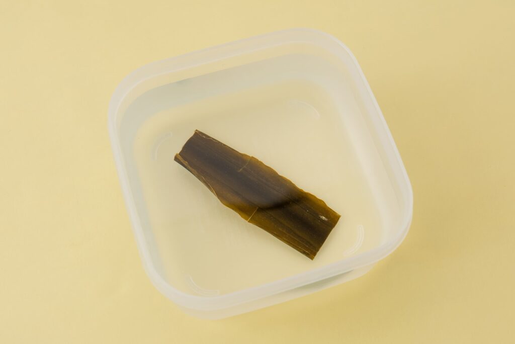 小鍋に水、ぬれぶきんでさっとよごれをふいた昆布を入れ30分程つける。