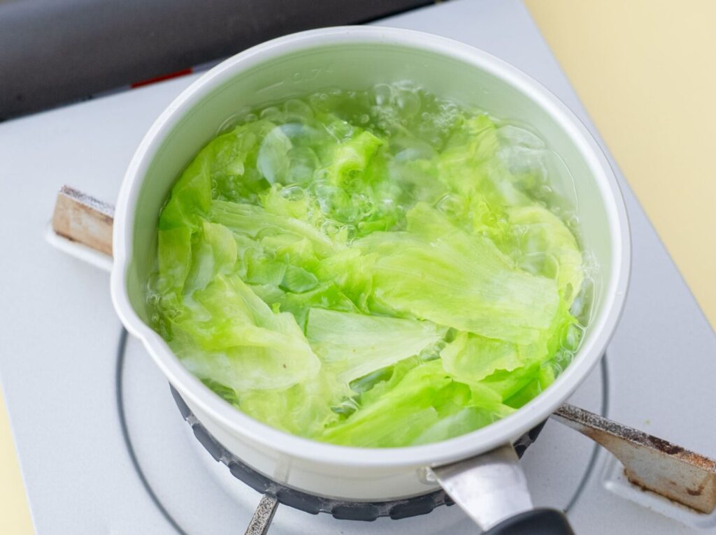 小鍋に湯を沸かし、細かくちぎったレタスを入れてやわらかくなるまでゆでる。