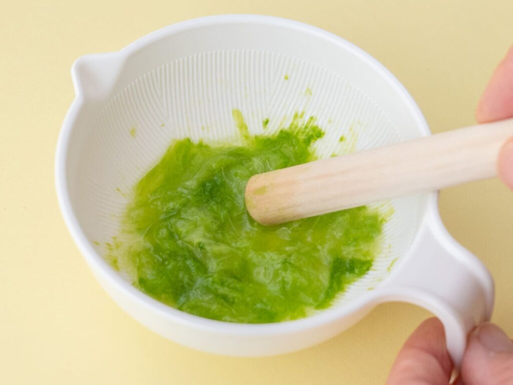 すり鉢などですりつぶし(ハンドブレンダーなどを使用してもOK)、必要であればゆで汁を加えてなめらかになるまでのばし、赤ちゃんの発達に合わせて必要であれば裏ごしする。