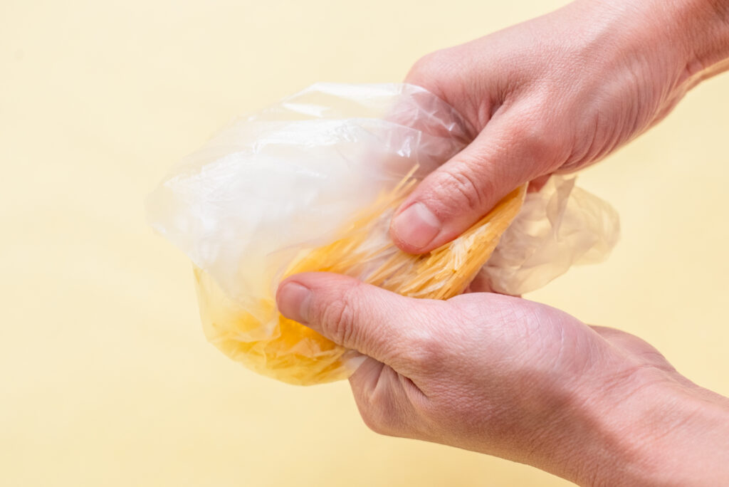 スパゲティは5mm長さに折ってやわらかくゆでる。