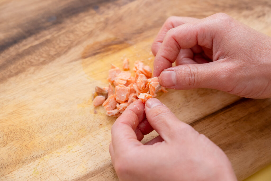 生鮭は火が通るまでゆでて細かくほぐし、レタスはやわらかくゆでてみじん切りにする。