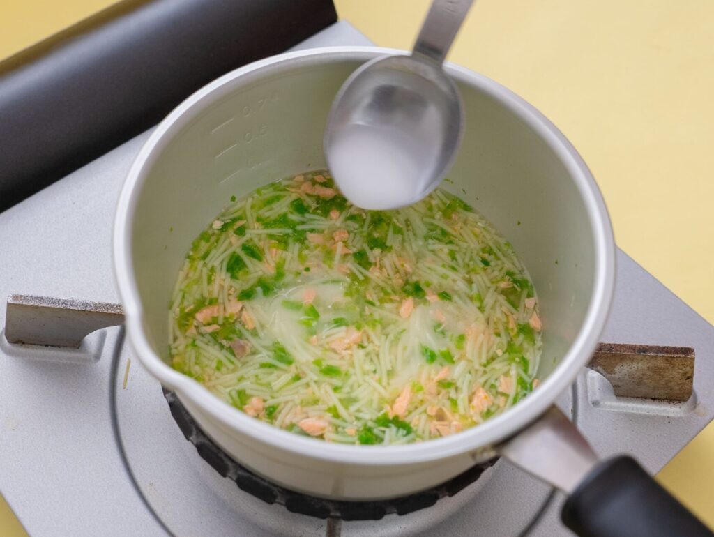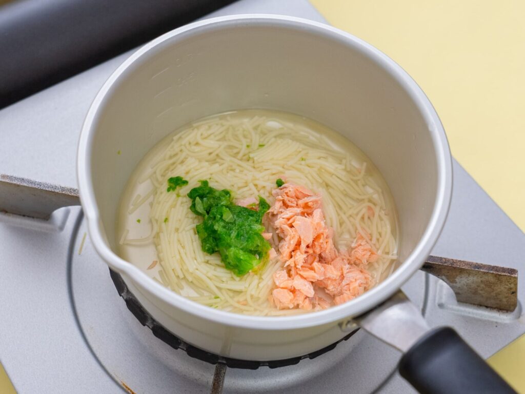 小鍋に①、②、野菜スープを入れてひと煮立ちさせる。