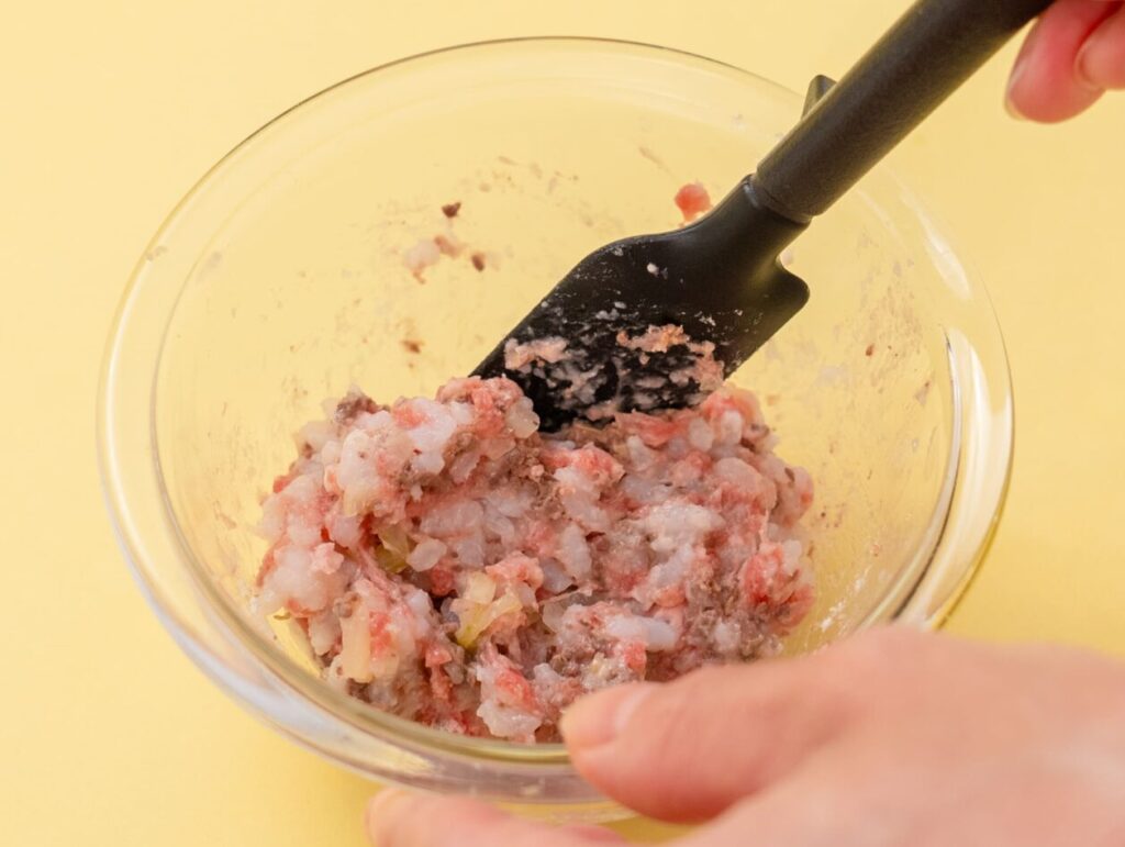 ボウルに軟飯、豚ひき肉、①、②、小麦粉、塩を入れてよく混ぜる。
