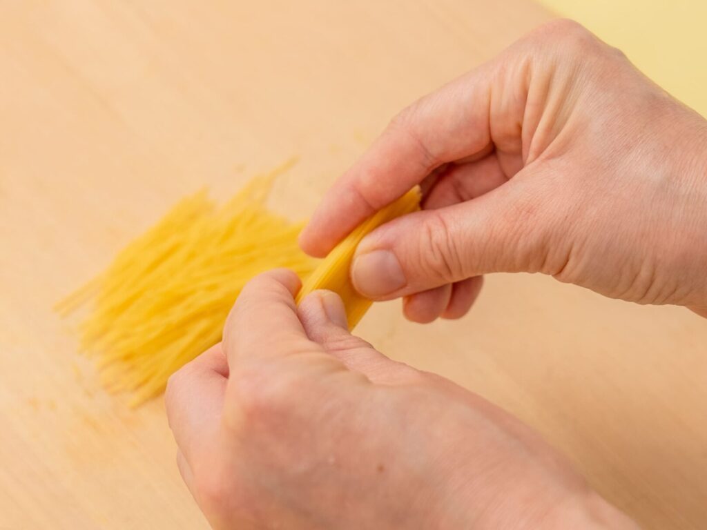 スパゲティは3cm長さに折ってやわらかくゆで、器に盛る。さやいんげんは5mmサイズに切る。