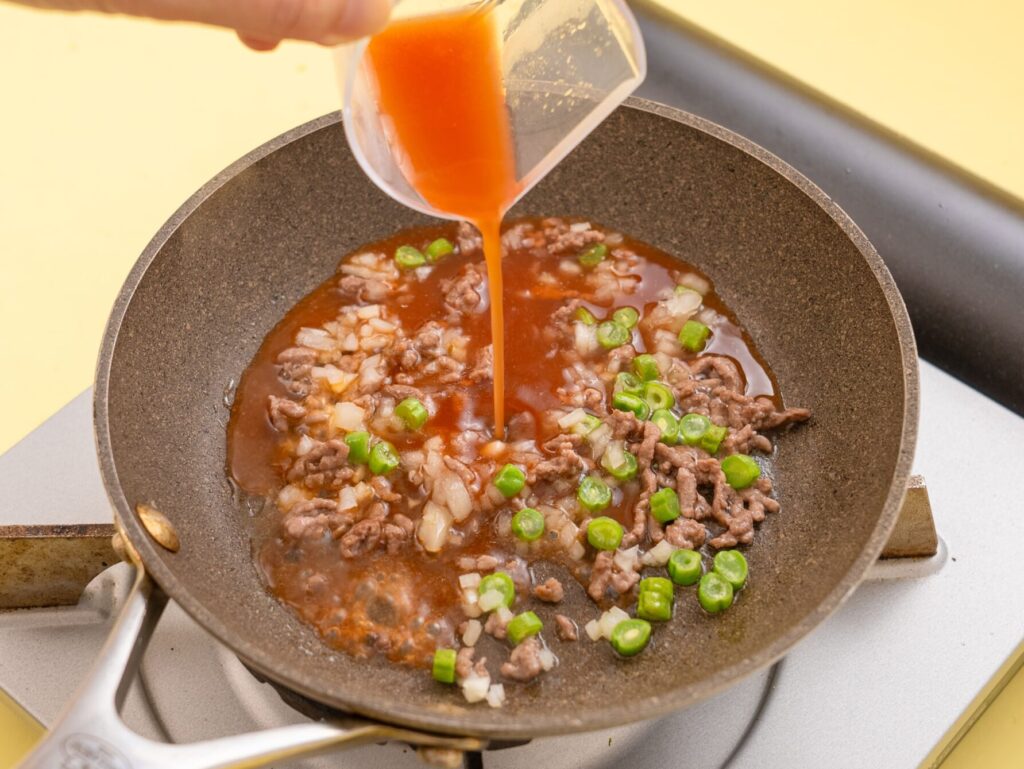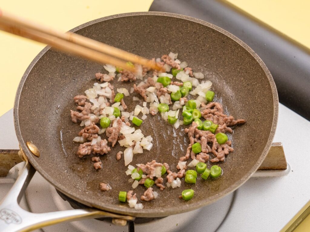 フライパンにサラダ油を熱し、合い挽き肉を炒め、肉の色が変わったら①のさやいんげん、玉ねぎを加えて炒める。