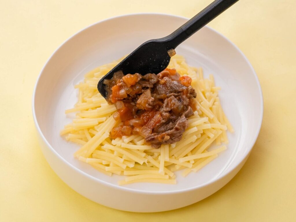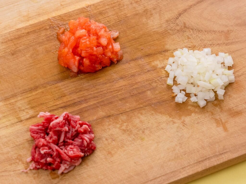 玉ねぎはみじん切りにする。トマトは皮と種を除き、細かく刻む。牛肉は細かく刻む。