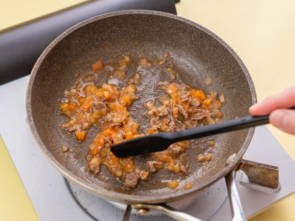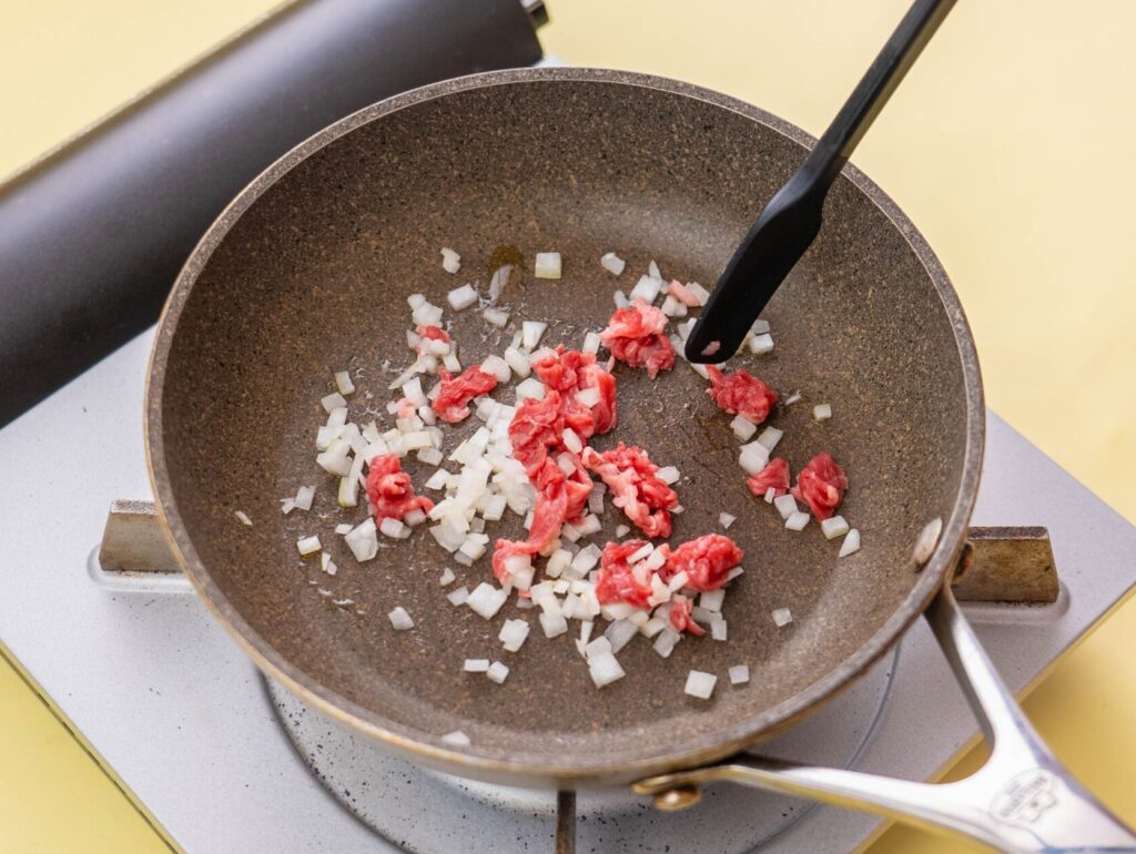 フライパンにオリーブ油を中火で熱し、牛肉と玉ねぎを入れて1分ほど炒める。