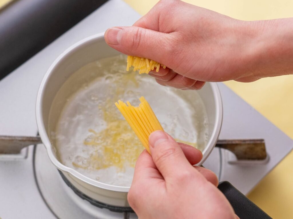 スパゲティは2〜3cm長さに折り、表示より少し長めにやわらかくゆでる。