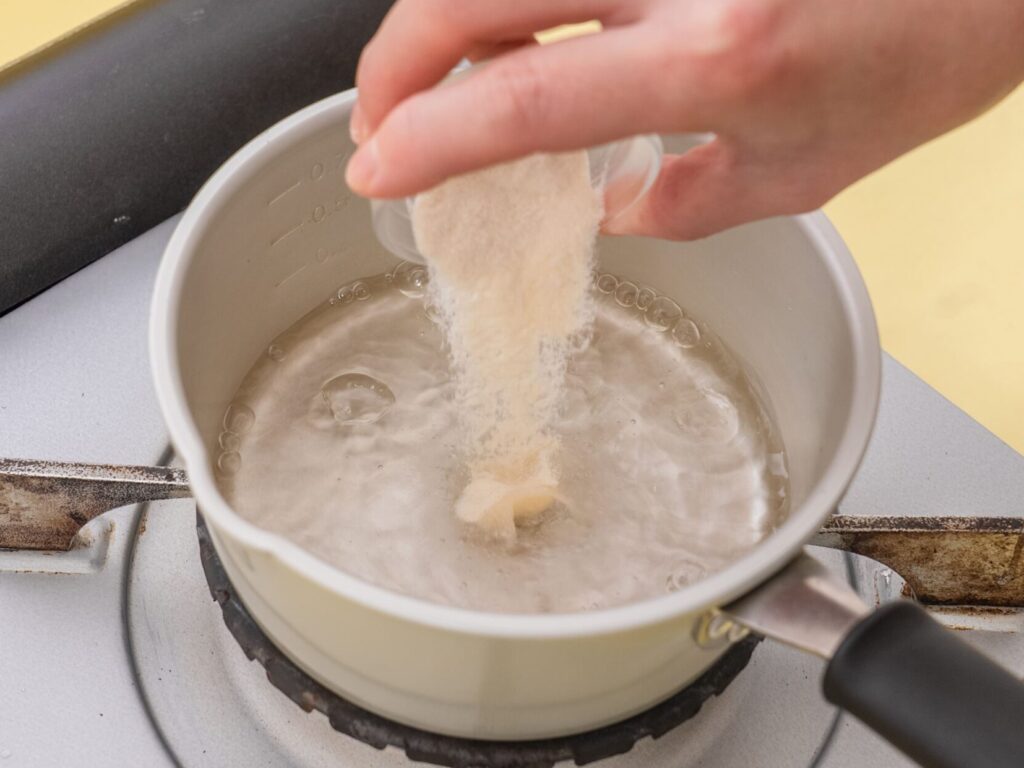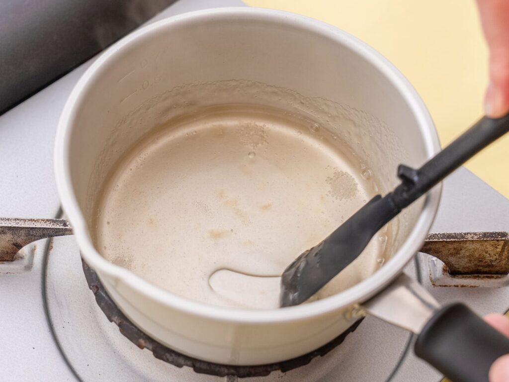 中火で熱し、沸いてきたら弱火にする。耐熱性のゴムベラなどで1分ほど混ぜながら加熱し、しっかり煮溶かす。