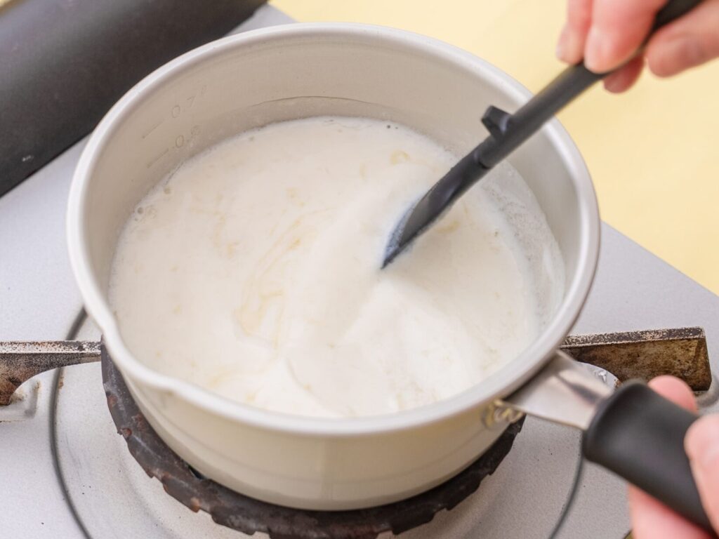 牛乳を少しずつ加え、沸騰させないよう注意しながら混ぜて温める(軽くふつふつする程度まで)。