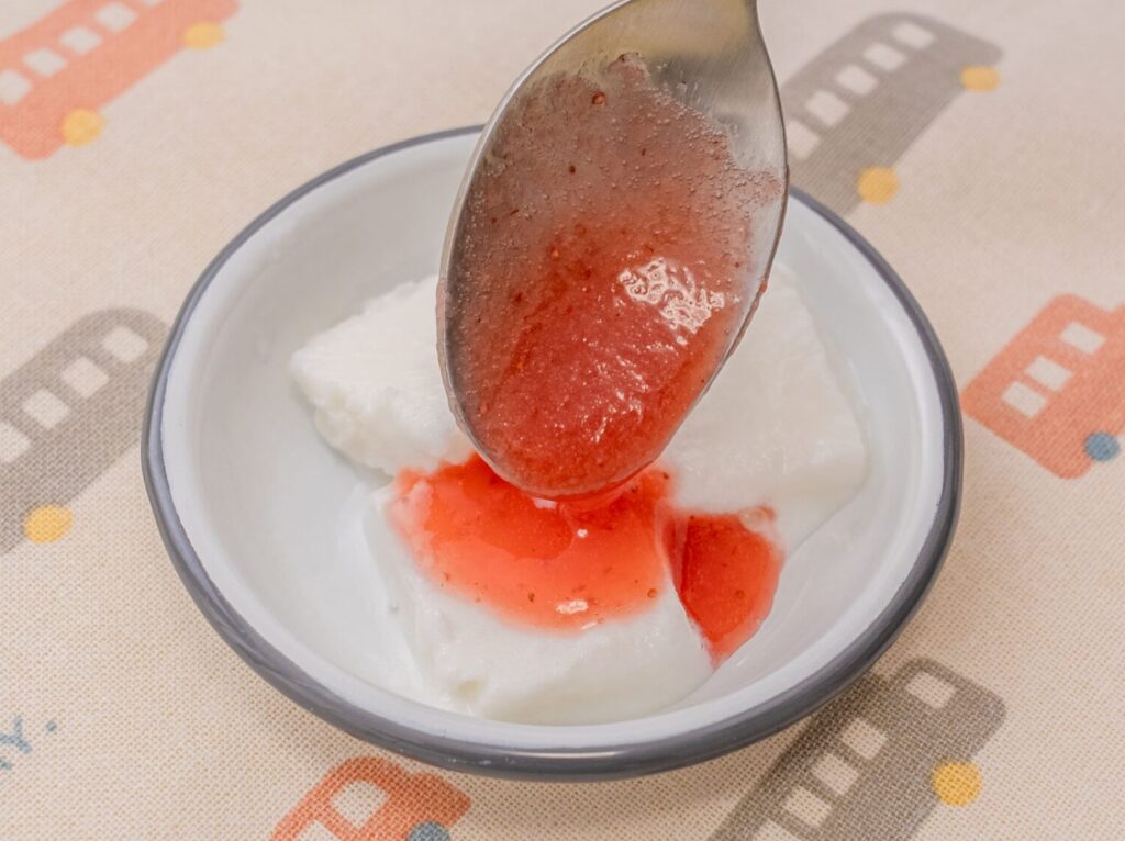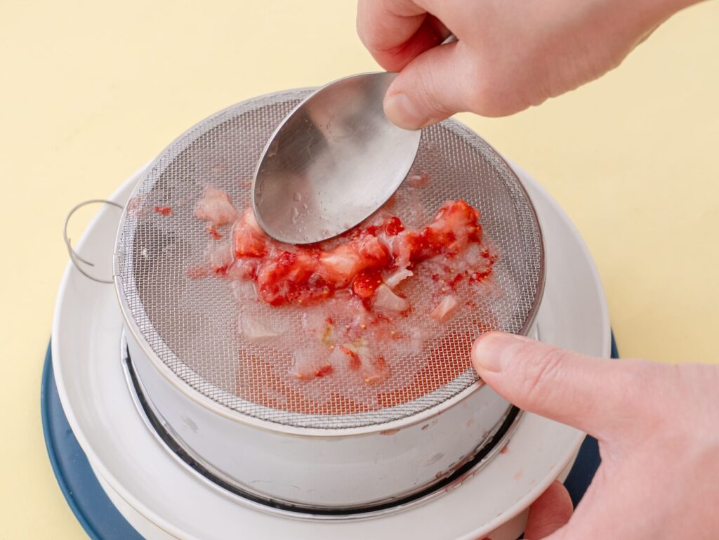 ③の火を止め、粗熱が取れたら容器やバットに入れて、冷やし固める。冷やし固めている間に、いちごを刻み、つぶして裏ごししておく。