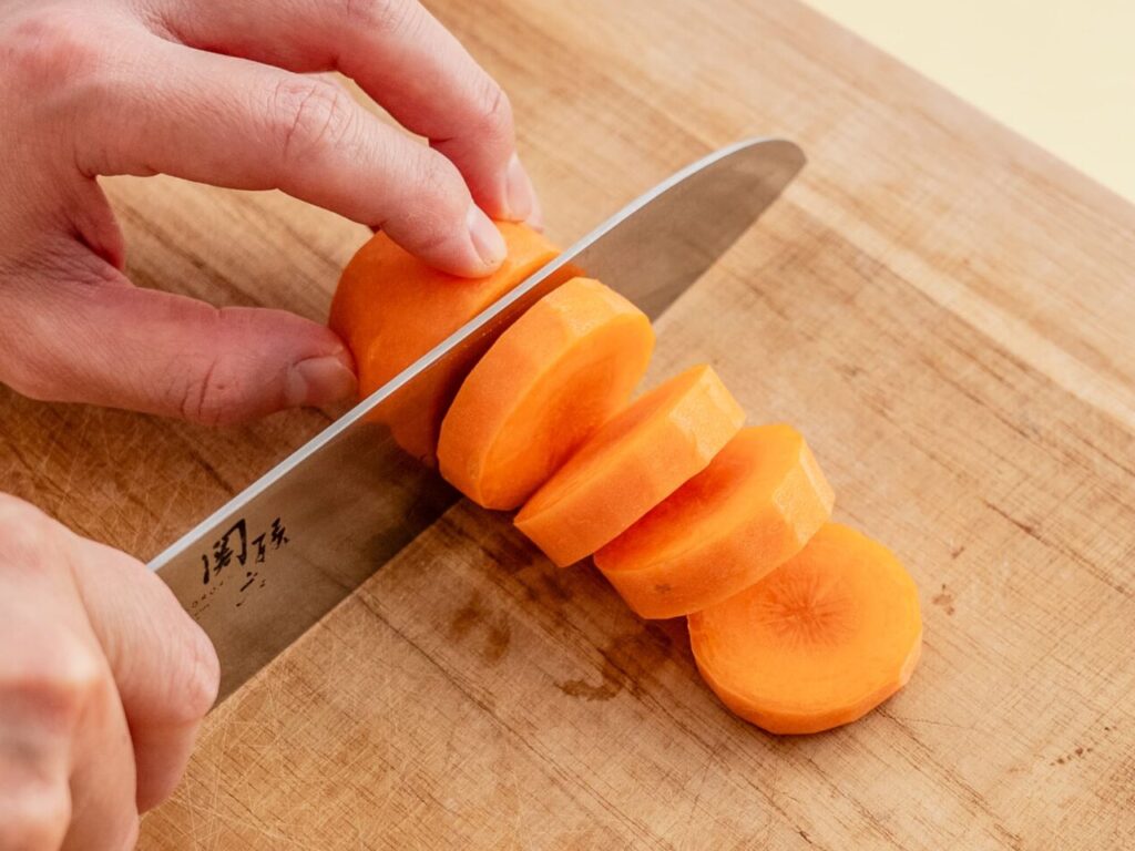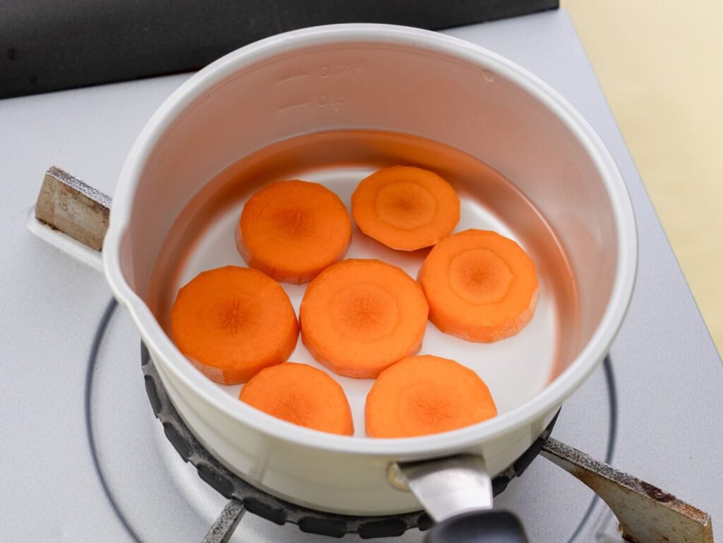にんじんは皮をむいて1cm厚さの輪切りにする。
